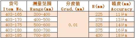 1.配可調測砧,測量范圍大 Bigger measuring range with adjustable anvils. 2.管式噴塑尺架,強度好 Paited pipe frame. 3.硬質合金量面 Carbide measuring faces.